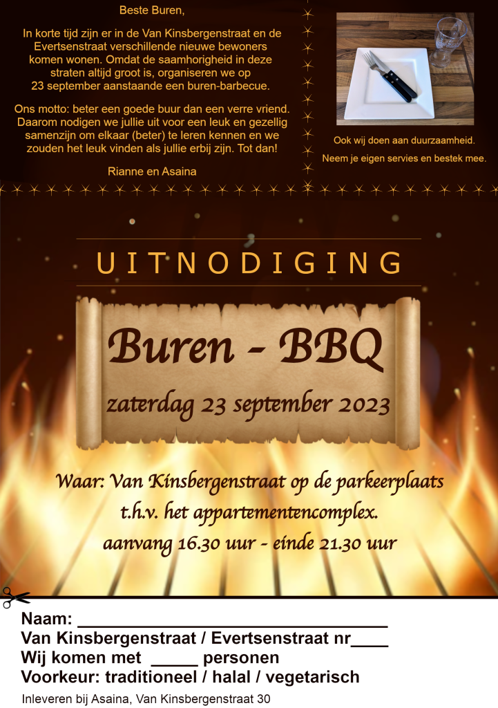 Op Burendag, 23 september 2023, willen we voor de bewoners in de Van Kinsbergenstraat (1-30) en de Evertsenstraat (even nummers 2-18) een burenbarbecue organiseren.