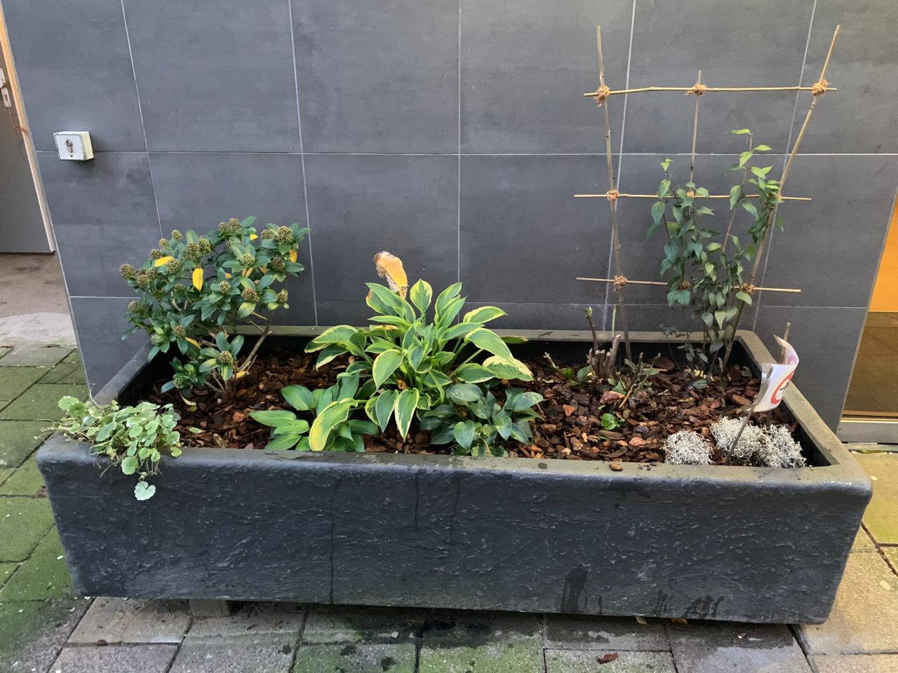 Bloembakken bij portieken en achtertuin.