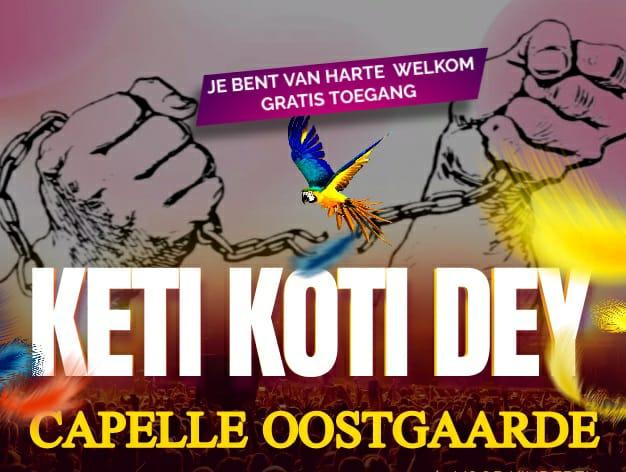 Wij willen de bewoners van Oostgaarde uitnodigen om deze herdenkingsdag, “Keti Koti Dey", gezamenlijk te vieren. Er zullen verschillende activiteiten toegankelijk zijn voor iedereen, jong en oud. Te denken aan workshops, muziek en dans, kunst, verhalenverteller, gratis popcorn, suikerspin en springkussens, haren vlechten, schminken voor de kinderen. Er zullen ook tijdens het feest verschillende gerechten, hapjes, cakesoorten en drankjes voor een betaalbare prijs aangeboden worden.