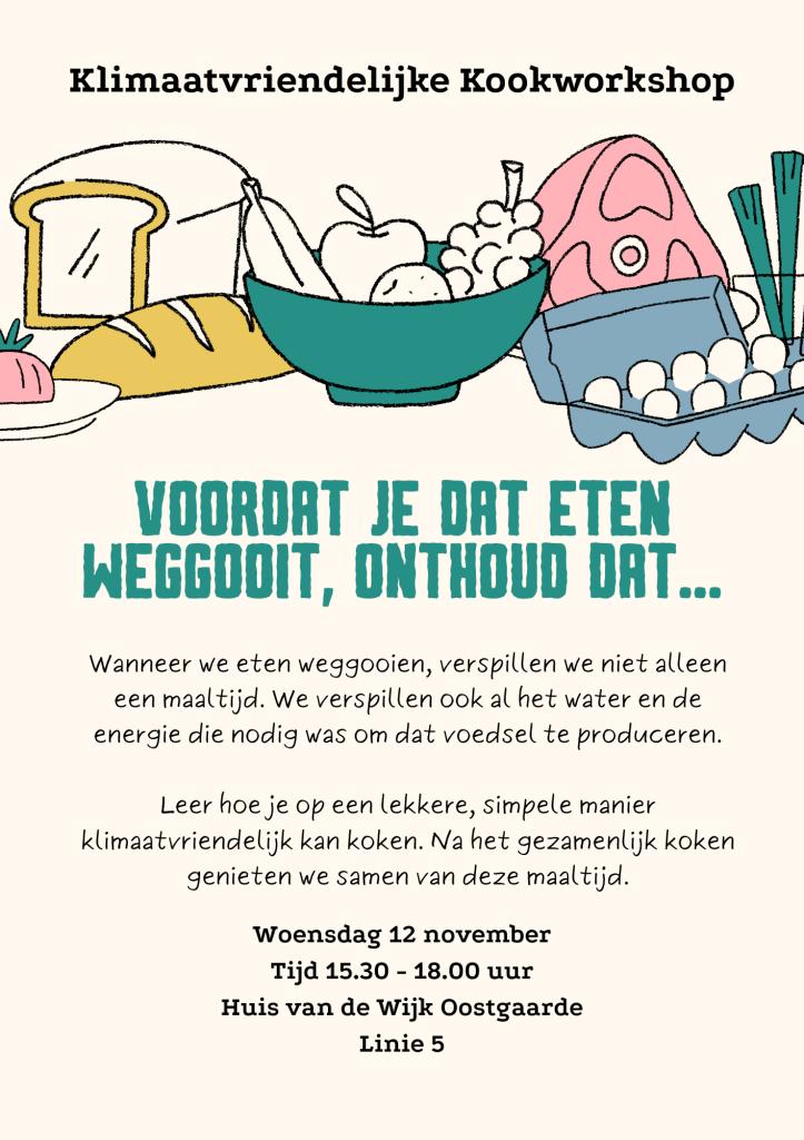 Wij willen graag in de Klimaatweek een eenmalige Klimaatvriendelijke Kookworkshop organiseren in het Huis van de Wijk. Ik ondersteun een betrokken vrijwilliger die deelnemers leert hoe je op een lekkere, simpele manier klimaatvriendelijk kan koken. Na het gezamenlijk koken genieten we samen van deze maaltijd. Kookervaring is niet nodig.