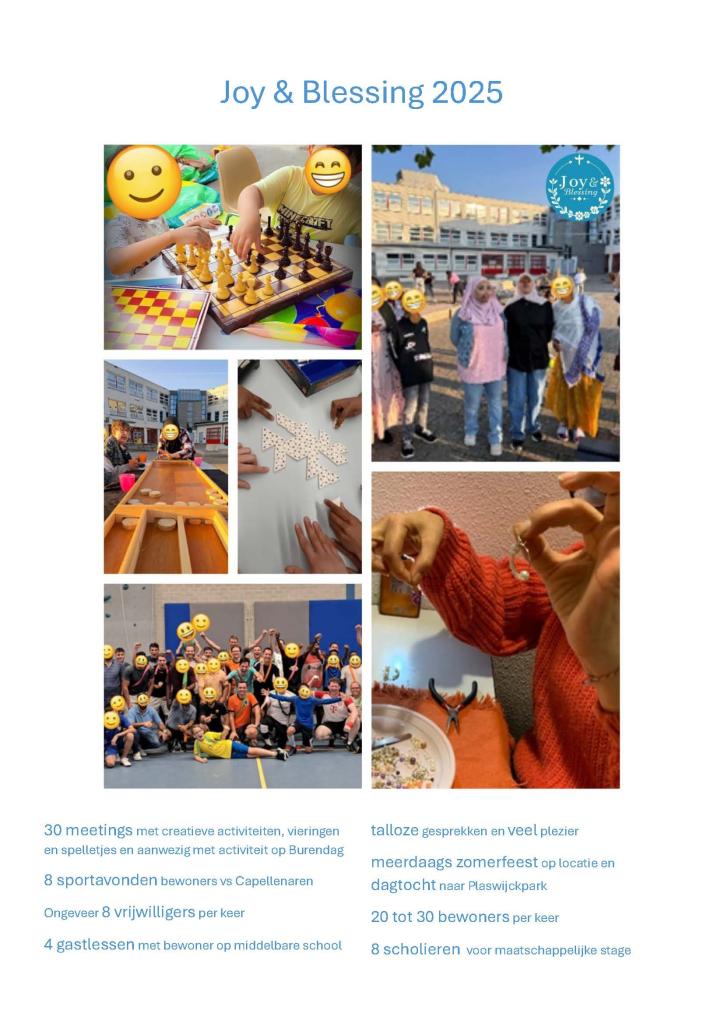 Op dit moment wordt het programma gedragen door een betrokken groep van ongeveer tien vrijwilligers onder de naam 'Joy&Blessing'.. Zij investeren tijd, aandacht en energie in het opbouwen van relaties, het creëren van een veilige sfeer en het signaleren van hulpvragen. De ervaring leert dat juist deze persoonlijke en regelmatige ontmoetingen een belangrijke bijdrage leveren aan het welzijn van de bewoners, het voorkomen van isolement en het verminderen van spanningen in en rond het AZC.