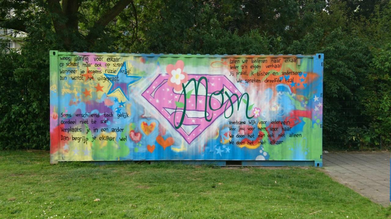Vorig jaar heeft de kunstenaar Ruud Kooger deze mooi bewerkt met graffiti en het gedicht over de vreedzame wijk.