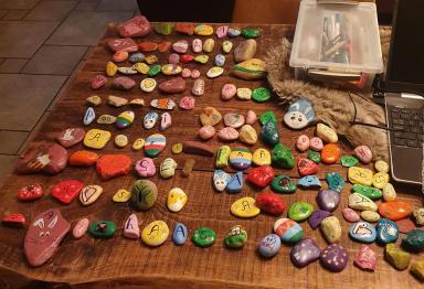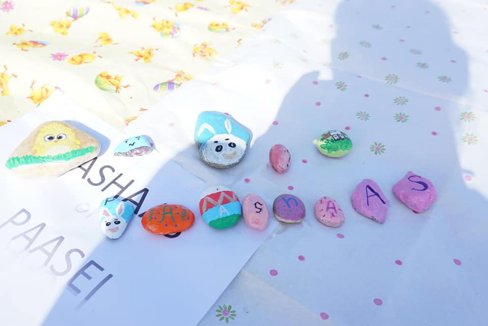 De kinderen moesten het woord 'paasei' of 'paashaas' zoeken. Wendy Bos, Michelle van der Kraan en Leen Rosina van der Stoep-de Geus hebben vanuit de Facebookpagina Kei Gers geholpen met het beschilderen van alle keitjes. Wat waren ze prachtig!
