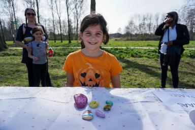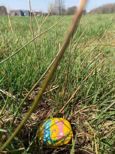 Op 31 maart was het zover: de kinderen konden in Hitland "Paaskeitjes" zoeken. Om 12:30 uur zijn we eerst een route gaan uitstippelen. Het was behoorlijk druk in het Hitland. De kans dat er al keitjes weg zouden worden gehaald was erg groot. Ondanks dat we briefjes hadden opgehangen om dit te voorkomen, hebben we toch besloten het grote stuk gras te gebruiken naast de grote waterspeeltuin. Daar werden de keitjes met de letters P, S, A, E, I en H verstopt, samen met wat jokers. Van sommige letters verstopten we extra om het iets makkelijker te maken.