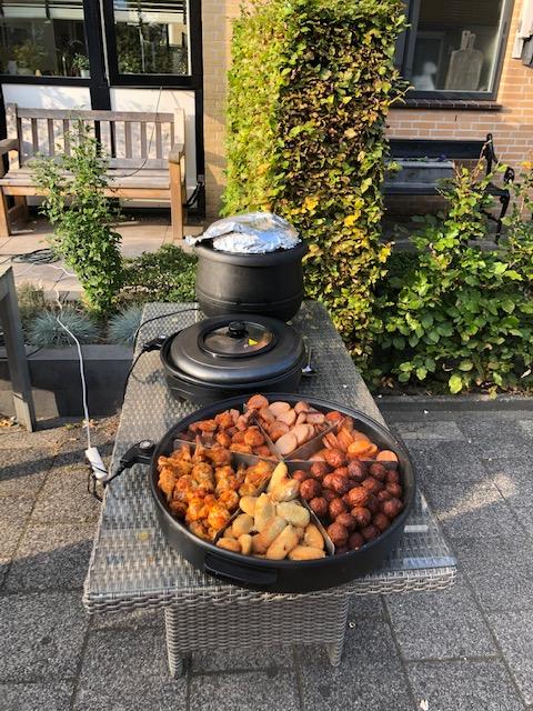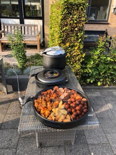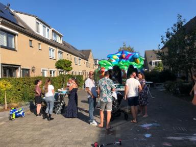 We begonnen de dag met koffie/thee en limonade met wat lekkers erbij en de kinderen waren zich aan het uitleven op het springkussen. Over de gehele dag was het een drukke, gezellig boel en zagen we buren die we normaal niet zoveel zien. We hebben het erg gezellig gehad met elkaar en we hebben heerlijk gegeten, plezier gehad en genoten van een drankje in de zon.