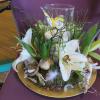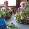 Na de pauze werd het mos rond gedeeld. Het stuk kreeg eindelijk vorm en iedereen werd enthousiast. Wat bollen erin omwikkeld met wol, narcissen, blauwe druifjes, hyacinten.....de schaal werd steeds mooier!