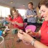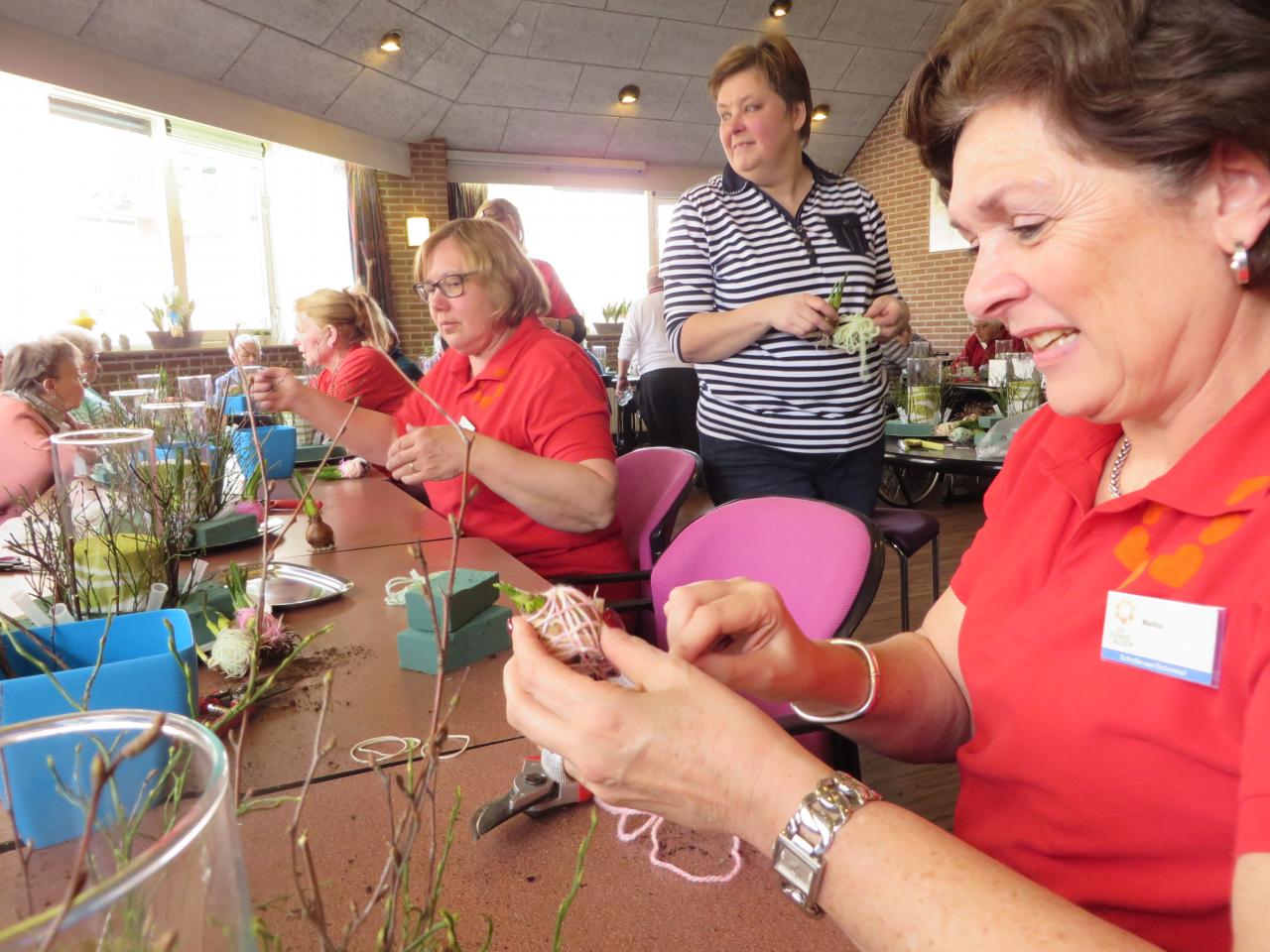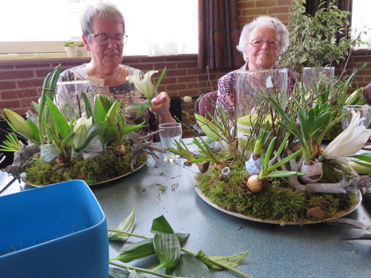 Het is 14.00 uur na een openingspraatje van Hanneke Verdoold kon Yvonne Mulder van start. Alle 25 gasten hadden allemaal een schaal, een oase en een vaas. Maar hoe maak je hier iets moois van?! Als eerste werd de vaas gevuld met steentjes. Er werd een soort van patroon gemaakt van kleuren, daarna werden de takjes uitgedeeld die rondom de glazen vaas geplaatst werden. Daarna buisjes voor de bloemen die later zouden volgen.