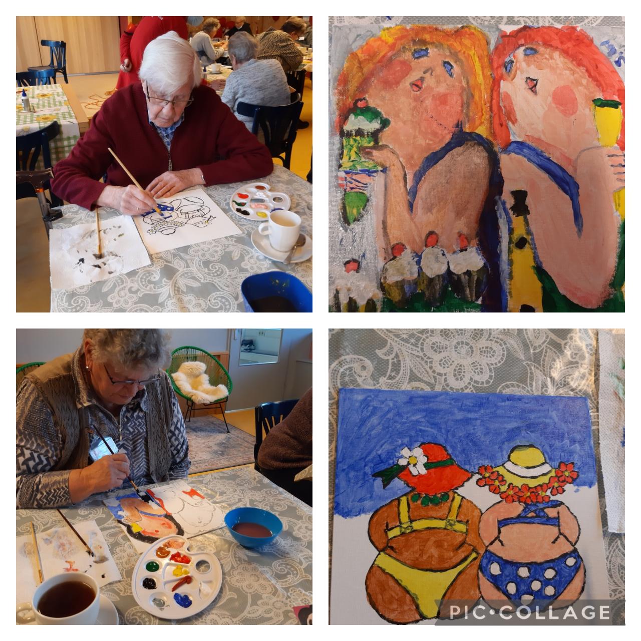 Cisca had de middag voorbereid door de 'dikke dames' al vooraf te tekenen op het canvas en de voorbeelden voor de te leggen knopen uit te snijden. De schilderessen én schilders konden hierdoor gelijk aan de slag om de canvassen van kleur te voorzien. De 'knopendames' konden hun vlinder, hart, kip of boom ook direct beplakken met gekleurde knopen. Dit zorgde voor een mooi eindresultaat. De gasten gingen trots en tevreden met hun eigen creaties naar huis.