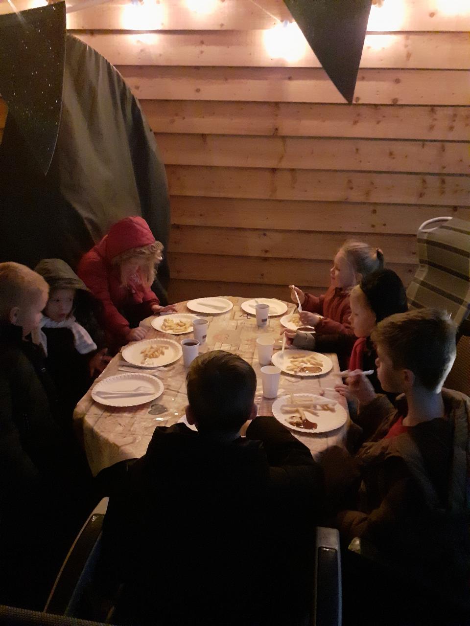 Na het eten van lekkere patat en snacks op het plein alles klaar gemaakt voor de volgende activiteit: Hapje en drankje met de volwassenen er bij. Gelukkig was het toen droog. De sociale contacten werden weer even gezellig aangesterkt!