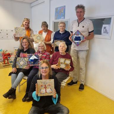 Opmerking van Adriana: Het was geweldig om met zo’n gevarieerd gezelschap in de leeftijd van eind 50 tot 90+ te mogen werken. Er zijn 8 heel verschillende werken ontstaan en vooral na het voegen (wat toch de finishing touch is) was men verbaasd over en heel blij met het werkstuk wat ze zelf hadden gemaakt.