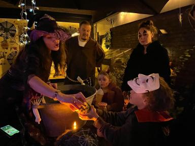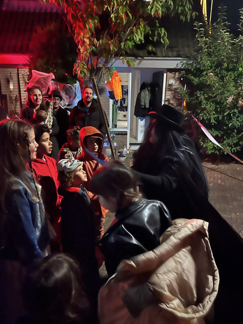 Alle kinderen verzamelen in de Binnenhof. Het Halloween feest start met de 'Heks' die de kinderen verteld over het enge spookpad en de enge versierde snoephuizen waar de ze heen kunnen voor de snoepjes.