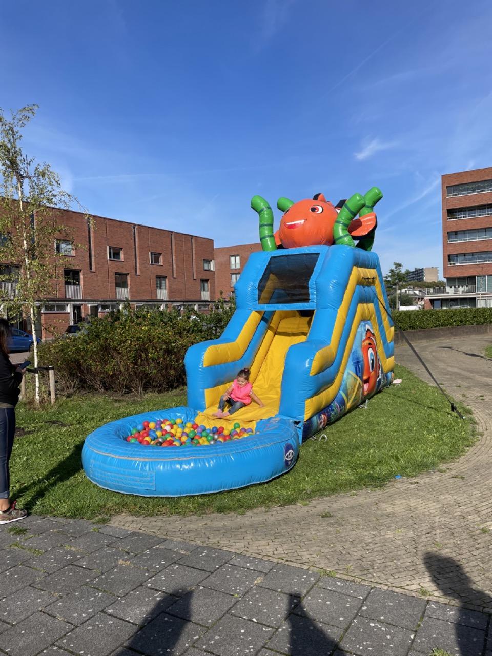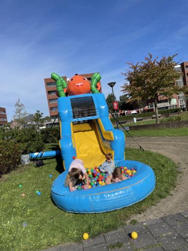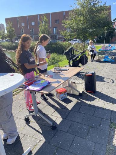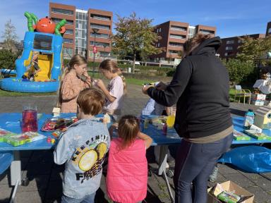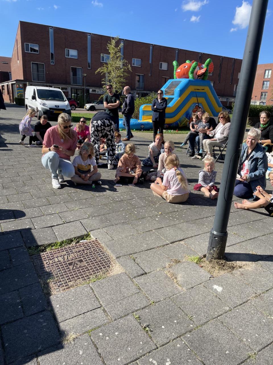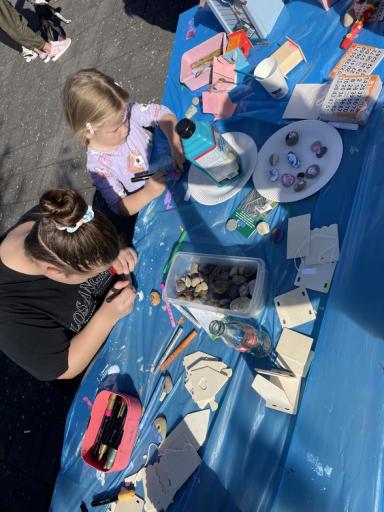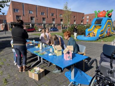Er stond een superleuk springkussen waar groot en klein enorm van genoten heeft. De buurtkinderen hadden spulletjes verzameld voor de verkoop op hun kleedjes. Jong en oud was druk aan het knutselen aan de knutseltafel buiten. Happy Stones werden druk versiert en in het plantsoen gelegd als verrassing voor de gelukkige vinders, maar ook aan buren uitgedeeld. En de mooiste vogelhuisjes werden gemaakt.