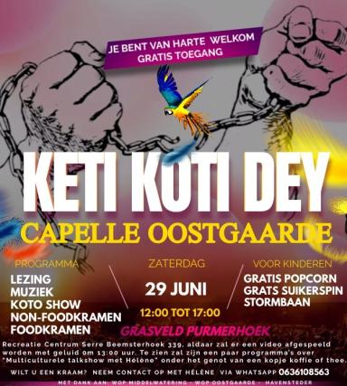 Het Keti Koti herdenkingsevenement, gefinancierd door de genereuze donaties van WOP Oostgaarde en Havensteder, werd gehouden ter ere van de afschaffing van de slavernij in 1863 in de voormalige Nederlandse koloniën Suriname en de Antillen. Dit culturele evenement had als doel om onze gemeenschap te onderwijzen, verenigen en de diverse erfgoederen te vieren door middel van prikkelende presentaties, live muziek, kunst en dans. Het evenement was een groot succes en trok een breed publiek aan, variërend van jonge kinderen tot ouderen, die verschillende internationale achtergronden vertegenwoordigden, waaronder Nederlands, Afrikaans, Europees, Aziatisch en Latijns-Amerikaans erfgoed.