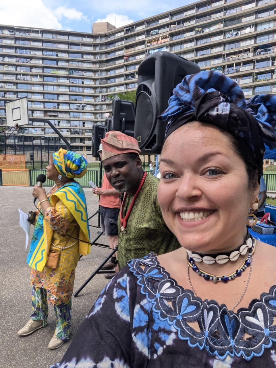Madeline verwelkomde ook het bredere publiek met een inwijdingsgroet en inleidende toespraak in een breed scala aan Afrikaanse en Europese talen om het diverse publiek welkom te heten op de dag van viering. Daarna gaf ze een Afro-Caribische dansvoorstelling en demonstratie van de verbindingen tussen Caribische sociale dansen en continentale Afrikaanse dansen, vroeger en nu. Deze voorstelling betrok publiek van alle leeftijden en achtergronden bij Afrikaanse bewegingen en muziek ter viering van het gedeelde erfgoed en de gedeelde geschiedenis van Keti Koti.