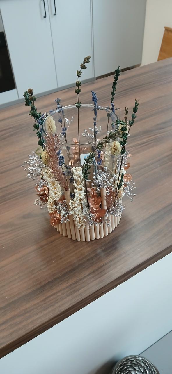 De vazen werden beplakt met nanotape,en daar werden dan rietjes op verschillende lengtes tegen aan geplakt,in de rietjes konden dan allerlei leuke gedroogde bloemen en takjes worden gestoken.