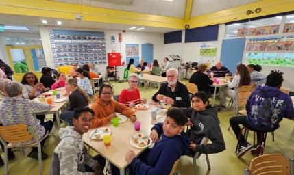 De tweede bijeenkomst was op 26 maart 2025. Op het programma stond een lunch. De leerlingen van groep 8 wilden zelf de boodschappen voor de lunch halen en vervolgens werd dat in het Kinderlab voorbereid tot een uitgebreide lunch met veel variatie in aanbod. De senioren genoten van die voorbereiding. De groep van zo’n 18 senioren had een andere samenstelling dan de vorige dus ook weer nieuwe deelnemers die het contact met groep 8 zagen ontstaan. Aan de tafels tijdens de lunch was het een combinatie van senioren en leerlingen. Dat leidde tot veel gesprekken, o.a. over de route van de leerlingen naar de middelbare school waar ze graag over vertelden. Na lunch werden spelletjes gedaan. Het was weer een waardevolle dag.