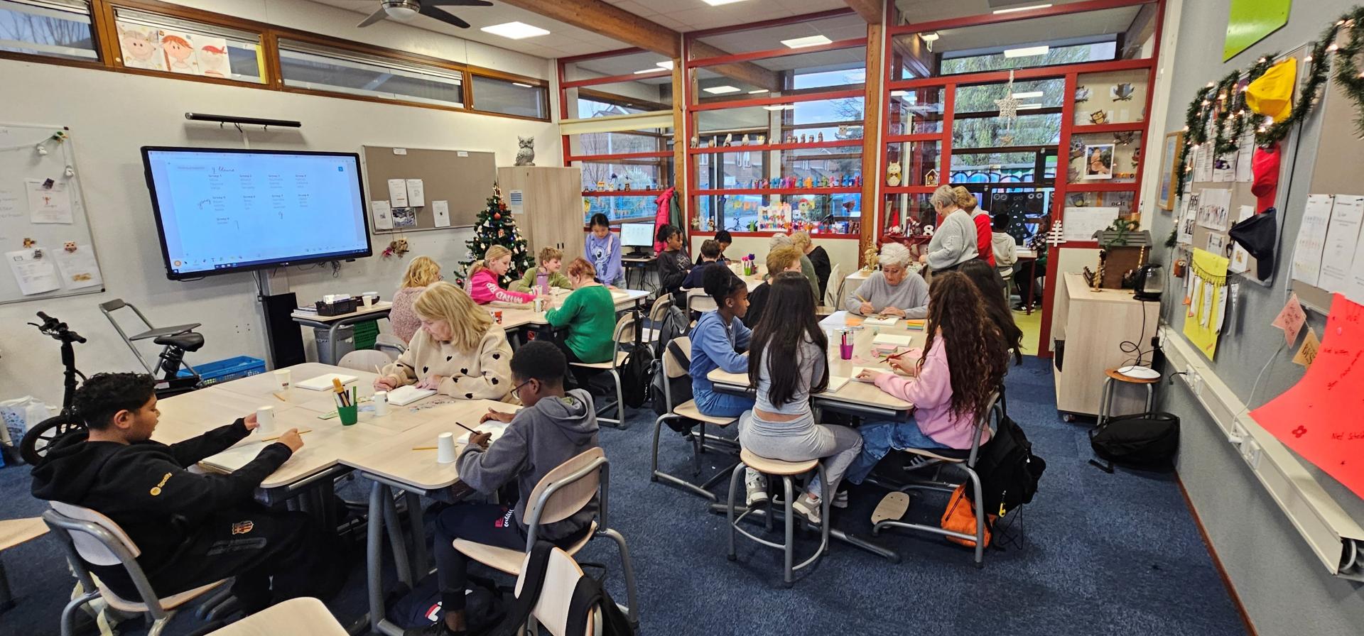 Het blijft leuk om te zien hoe de leerlingen van groep 8 enthousiast de senioren opwachten bij de ingang van de school. De senioren vertellen ons dat zij dit zo mooi en waardevol vinden. Ze worden warm ontvangen, naar een tafel begeleid en voorzien van koffie of thee. Het geeft duidelijk het gevoel welkom te zijn in de wereld van de school en de leerlingen.