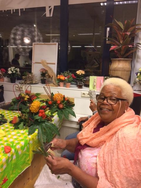 Zodra de 23 dames hun bakje koffie op hadden, ging de workshop beginnen. De workshopleidster vertelde aan de dames wat ze moesten doen. Aandachtig luisterden ze, zodat zij een mooi stukje konden maken. Na al het harde werken, kregen ze een lekker koud drankje en wat zoutjes. Naar achteren geleund konden ze naar hun mooi gemaakte stukkje kijken. Tijd om te kletsen en wat bij te praten. Iedereen had ongeveer hetzelfde gekregen om hun stukje te maken, maar toen ze klaar waren, zagen de stukken er allemaal anders uit! Kijk zelf maar naar de foto’s. We hebben niet al het geld opgemaakt in de hoop dat we op 12 december 2017 een kerststukje kunnen maken. Het is ook goedkoper uitgevallen, want we konden ook verschillend groen uit de natuur halen.