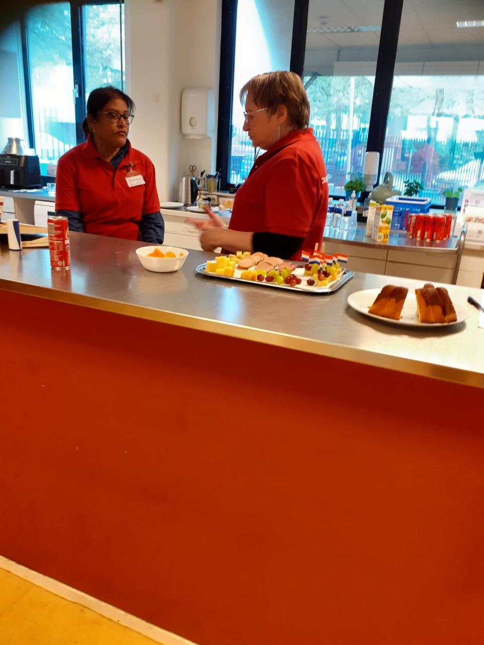 Terwijl iedereen druk bezig was, waren er 2 vrijwilligers die schalen met hapjes hadden gemaakt. Zij zorgden dat de gasten bij een hapje ook wat te drinken kregen.