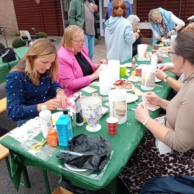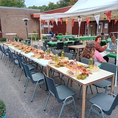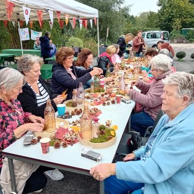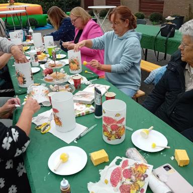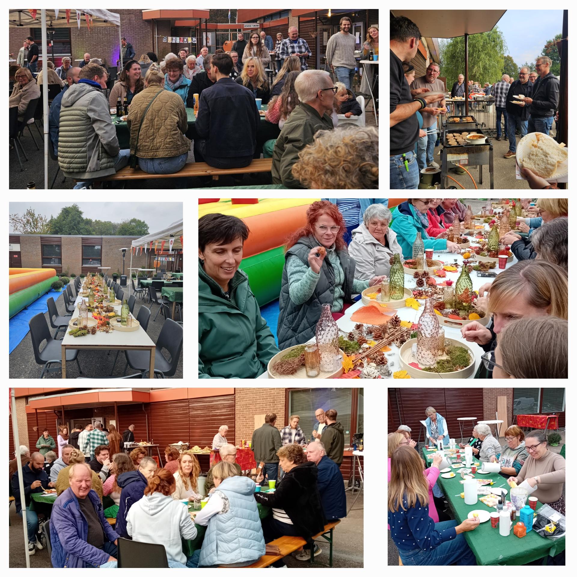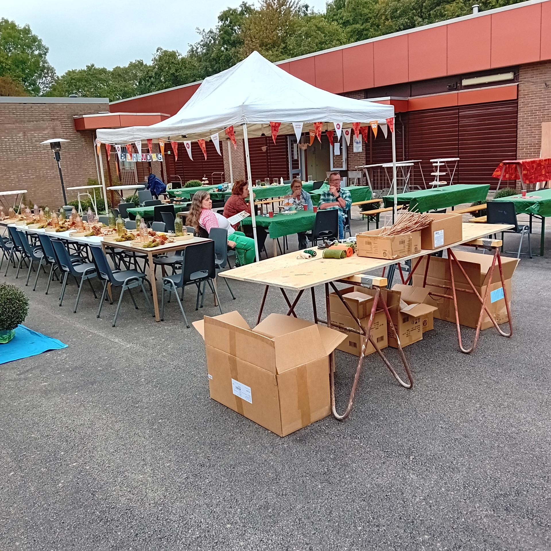 Vroeg in de ochtend begonnen op te bouwen met gelukkig een grote groep buren, die hielpen om alles klaar te zetten, in de middag zijn we begonnen met de workshops, herfststukjes maken en decoupage, aansluitend een bbq en na al het heerlijke eten een gezellige bingo .