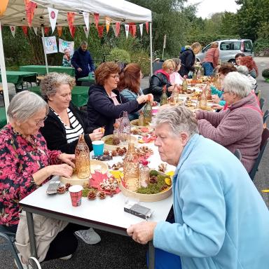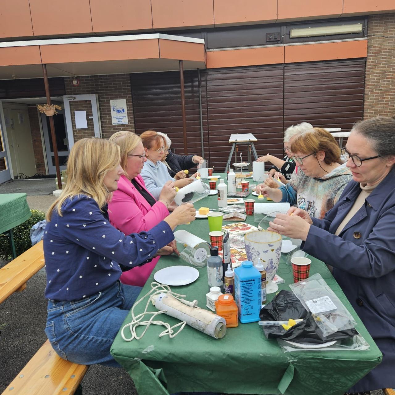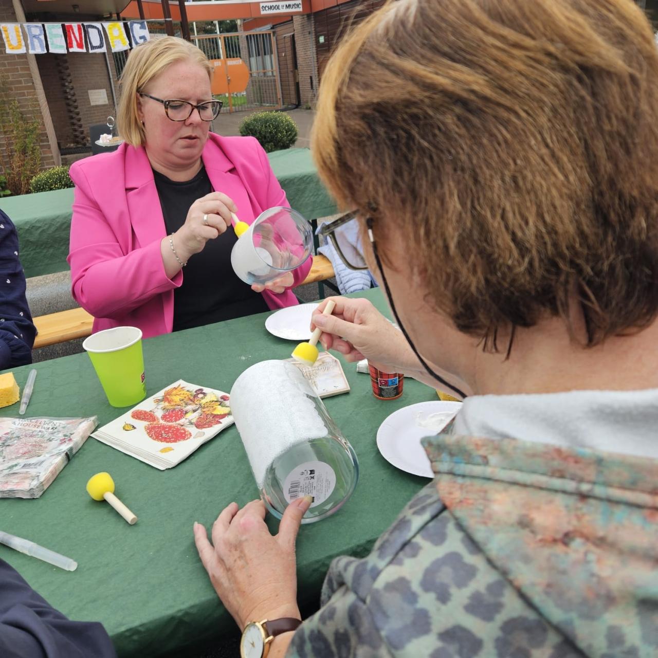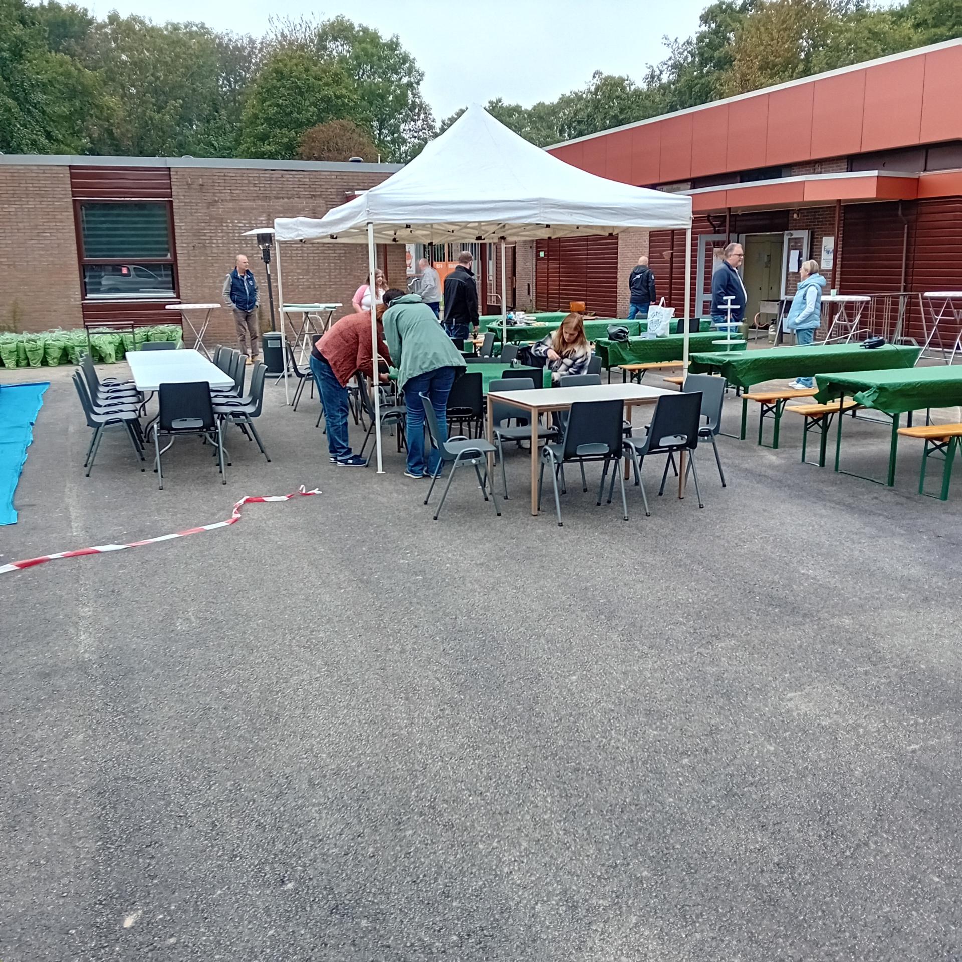Vroeg in de ochtend begonnen op te bouwen met gelukkig een grote groep buren, die hielpen om alles klaar te zetten, in de middag zijn we begonnen met de workshops, herfststukjes maken en decoupage, aansluitend een bbq en na al het heerlijke eten een gezellige bingo .