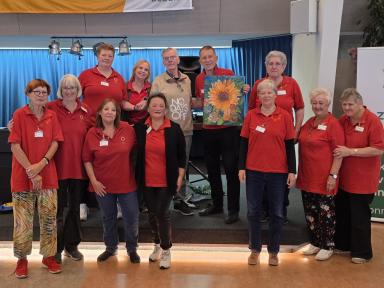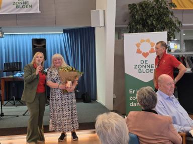 De heer Ton zette de vrijwilligers van de zonnebloem heel onverwachts in het middelpunt met een groots gebaar. Een Zonnebloem schilderij à la Van Gogh. Waarvoor een groot applaus!