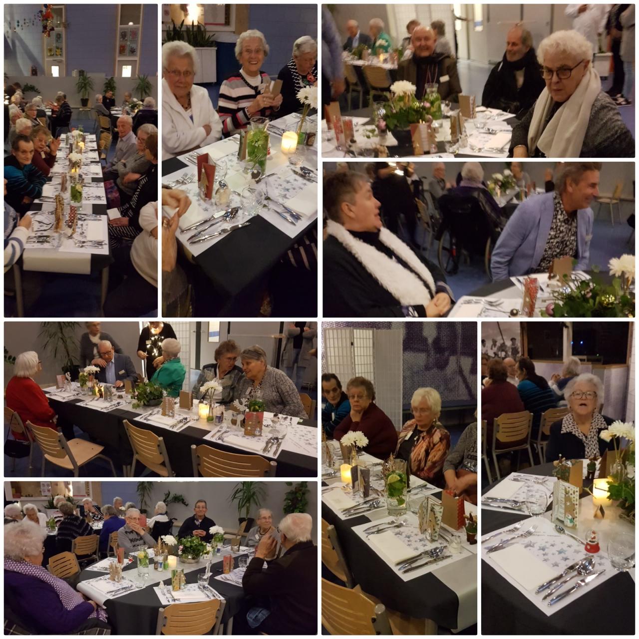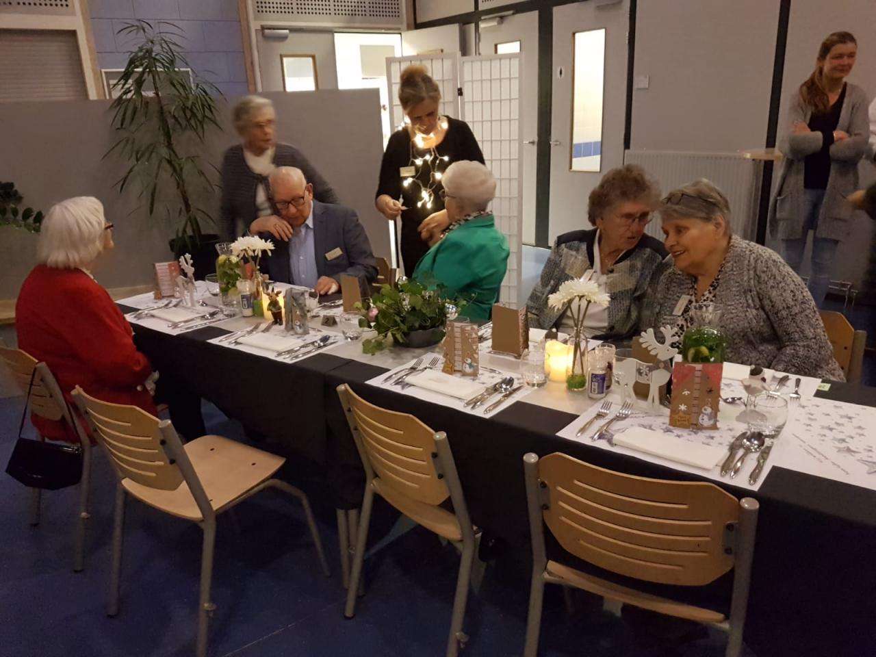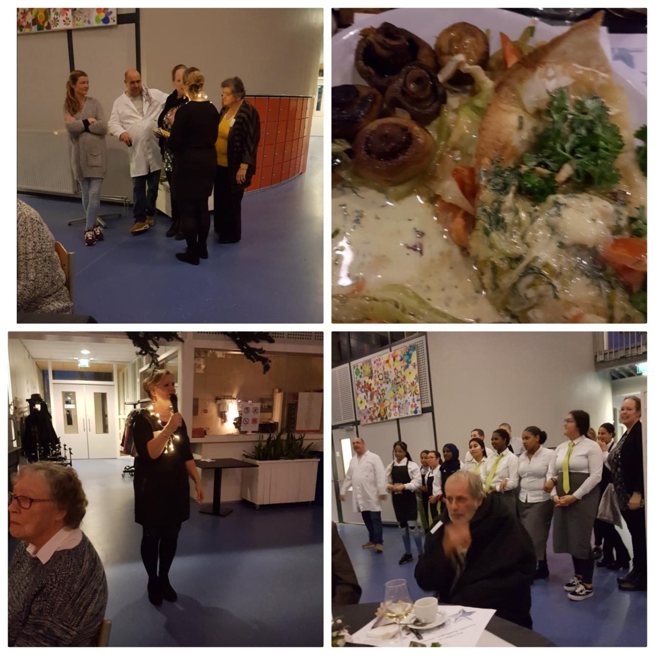 Donderdag 13 december was het eindelijk zover. Veel gasten van de Zonnebloem hebben kunnen genieten van een heerlijk kerstdiner, verzorgd door de leerlingen van de kaderopleiding van het IJsselcollege. Na binnenkomst werden door Sanne en Rosemary de jassen opgehangen en werd een ieder hartelijk welkom geheten door Hanneke. Er werd een lekker aperitiefje rondgedeeld: bubbeltjes sorbet van groene appeltjes. Daarna kwam het voorgerecht in een mooi wijnglas geserveerd. Dit bestond uit een mabre van gravad lax en schol met nog een lekker soepje erna. Na een mooi kerstverhaal, voorgedragen door Joke, werden de hoofdgerechten uitgeserveerd. Wat hebben we genoten van het vleesmenu (kalfwang) of het vismenu (kabeljouw). En er werd volop gezellig gekletst onder elkaar. Helaas kon onze Cisca met haar gitaar er, door priveomstandigheden, niet bij zijn waarop Christa met de andere vrijwilligers diverse kerstliederen inzette en er goed werd meegezongen. Toen volgde er nog een lekker dessert van Tiramisu met ijs en er werd afgesloten met een kopje koffie. Nadat de vrijwilligers de jassen weer hadden uitgedeeld ging iedereen voldaan weer huiswaarts na een erg gezellige avond.
