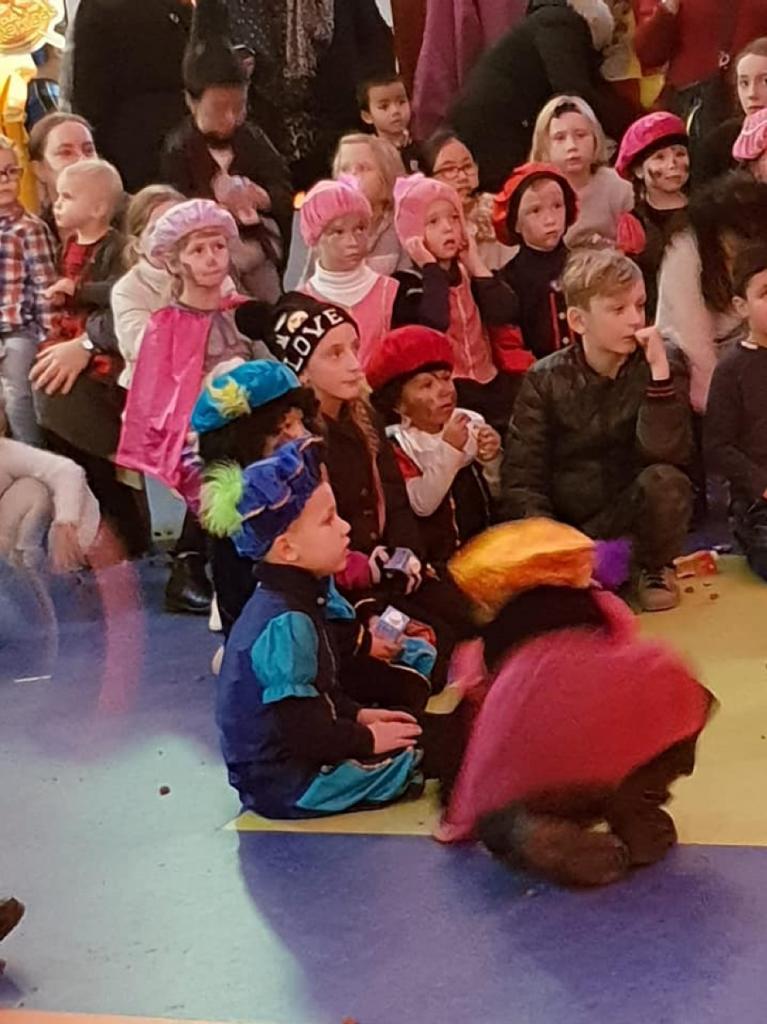 Het was een druilige dag: nat en koud. De opkomst was vermoedelijk hierdoor ietsje lager dan dat we gewend waren. Maar op het moment dat de show begon zat de Aula toch goed vol. Alle ouders achterin de zaal en de kinderen voorin. Het blijft tenslotte een kinderfeest. Lekker dichtbij de zwarte pieten want daar gebeurde het allemaal. De kinderen genoten zichtbaar van de show! Ze dansten en zongen dat het een lieve lust was.