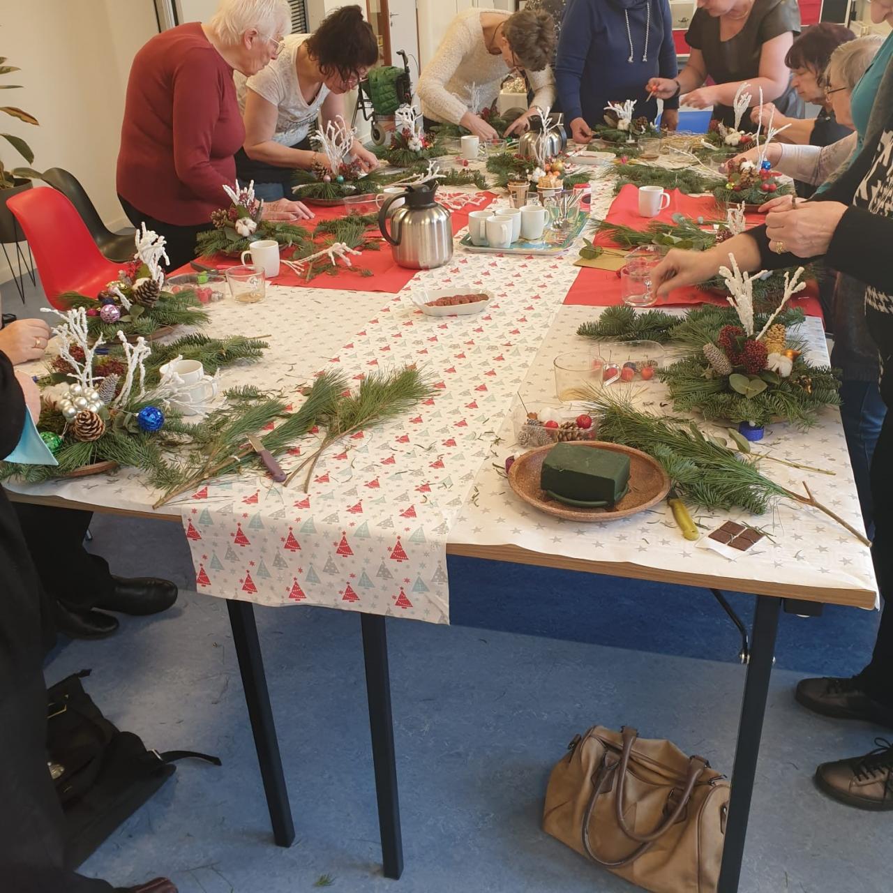 Samen met de deelnemers hebben wij dit jaar afgesloten met het maken van een kerststuk. Het is natuurlijk mooi om een prachtig kerststuk te krijgen, maar zelf eentje maken is veel leuker. Onder begeleiding van een ervaren deskundige hebben ze allemaal mooie stukken gemaakt. De deelnemers hebben elkaar geholpen waar nodig, wat was dat mooi om te zien. Na afloop hebben we samen geluncht en de stukken van elkaar bewondert. Zo hebben wij samen met onze deelnemers het jaar afgesloten en hopen wij dat we een prachtig en gezond 2020 tegemoet te gaan.
