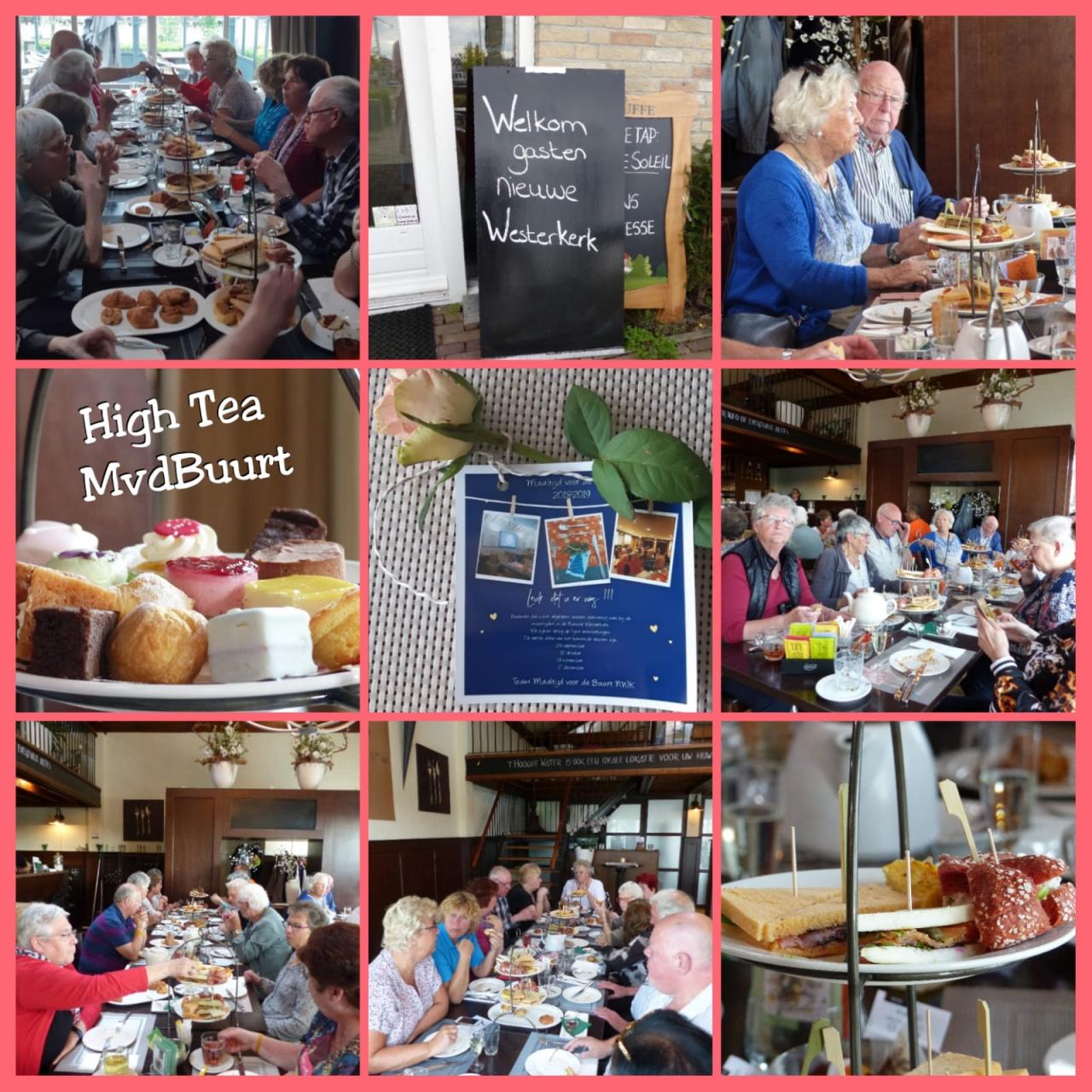 Daar kregen we een heerlijke high tea aangeboden. We werden ontvangen met een feestelijk glaasje Prosecco. Hierna kregen we hartige hapjes, een soepje en lekkere sandwiches. Daarna volgden de zoete hapjes, met muffins, scones, mini brownies en nog meer lekkers. Ondertussen werd er tijdens het theedrinken druk gekletst en veel gelachen. Iedereen had het erg naar zijn zin. In september gaan we weer gezellig gezamenlijk eten in de Nieuwe Westerkerk.